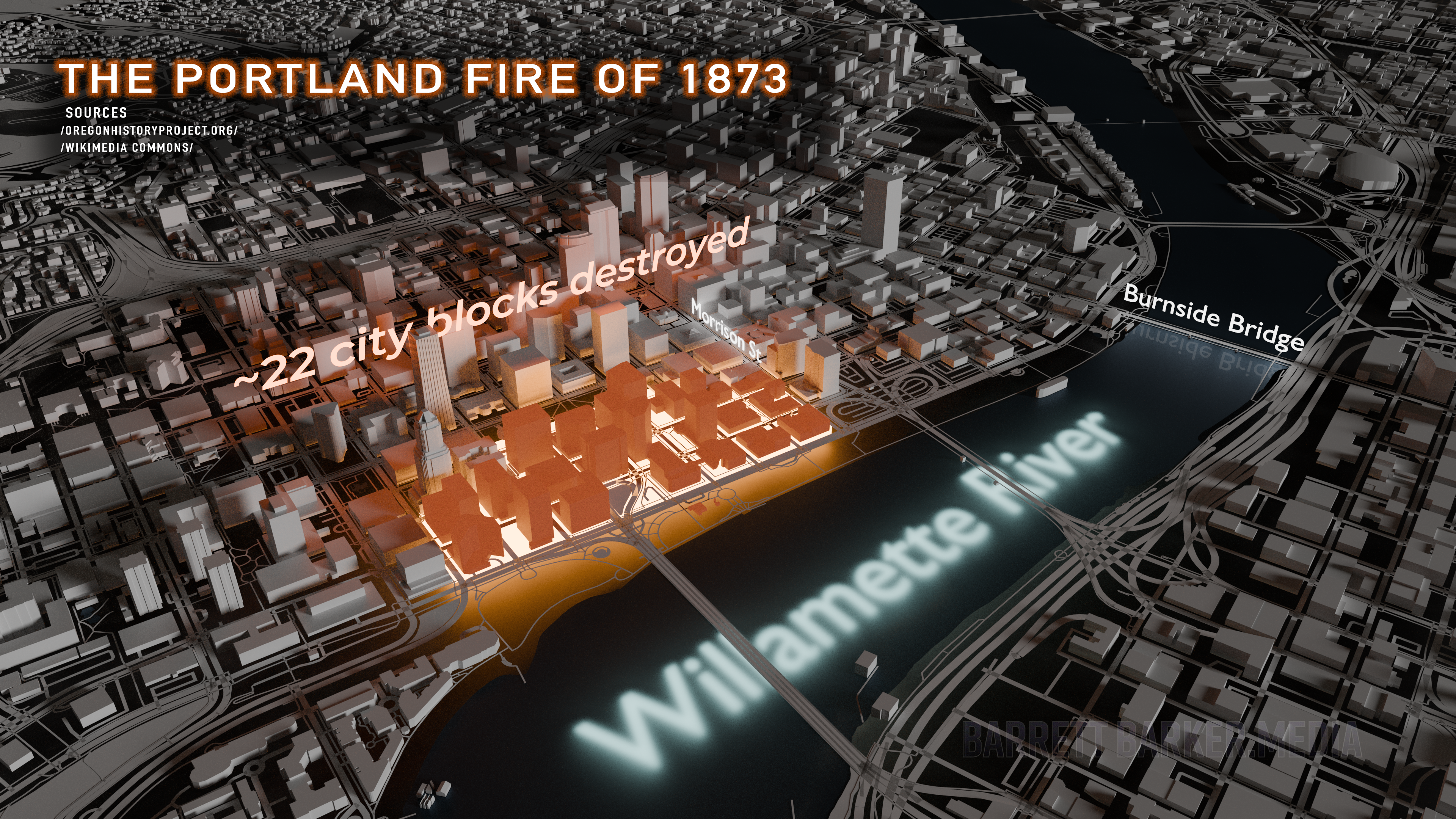 A 3D overview of the Portland, OR fire of 1873. City data obtained from openstreetmap.org, generated via Blosm in Blender.